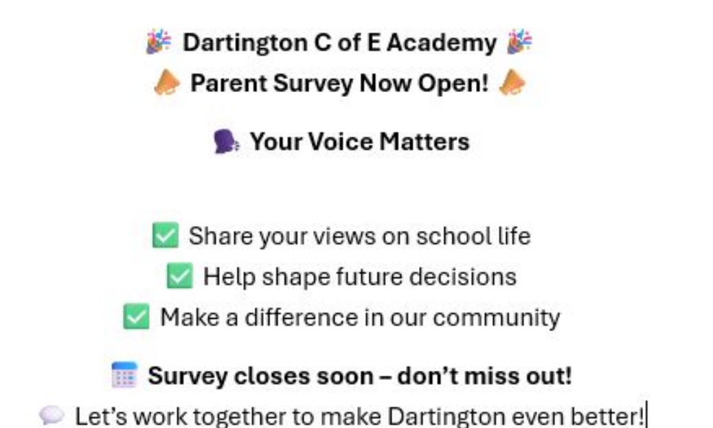 I would really appreciate it if you could take time to complete it. This is your chance to tell us how you feel about Dartington Academy, what you love and what we can improve on.